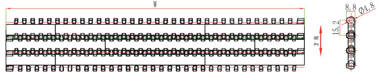 2.材質(zhì):網(wǎng)帶材質(zhì):聚甲醛(POM),銷軸材質(zhì):聚丙烯(PP);聚甲醛(POM)